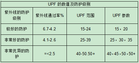 正规的防紫外线产品都应标有国家标准的编号及UPF值。在《纺织品防紫外线性能的评定》中规定:只有当产品的UPF(即紫外线防护系数)大于40,且UVA(长波紫外线)透过率小于5%时,才能称为“防紫外线产品”,这两个条件缺一不可。