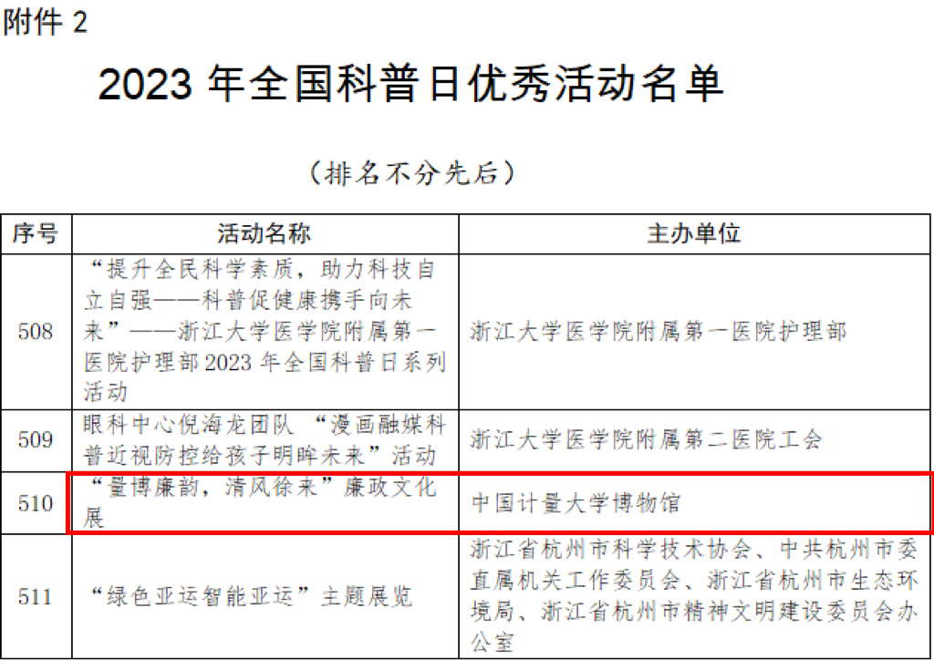 12.28日,中国科协办公厅印发《中国科协办公厅关于对2023年全国科普日有关组织单位和活动予以表扬的通知》(科协办函普字〔2023〕102号),对2023年全国科普日有关组织单位和活动进行工作表扬。我校计量博物馆获评2023年全国科普日活动“优秀组织单位”, 由博物馆报送的活动被评为2023年全国科普日“优秀活动”。
