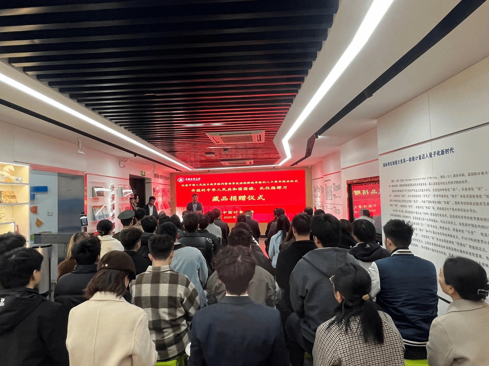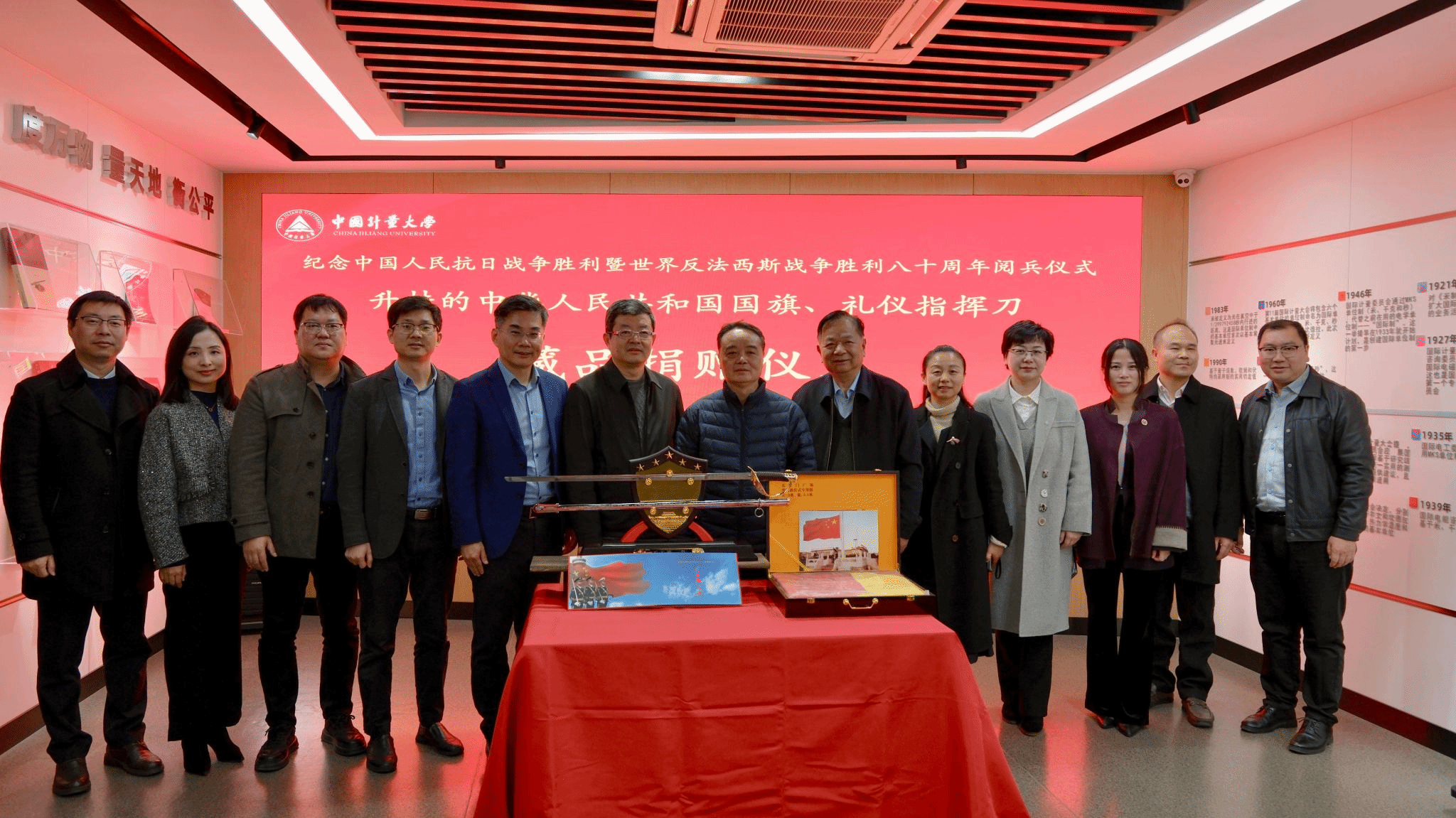 仪式上,我校博物馆正式接收两件承载民族荣光与使命担当的特殊藏品——纪念中国人民抗日战争胜利暨世界反法西斯战争胜利80周年阅兵仪式现场升挂的中华人民共和国国旗和阅兵仪式现场使用的礼仪指挥刀。