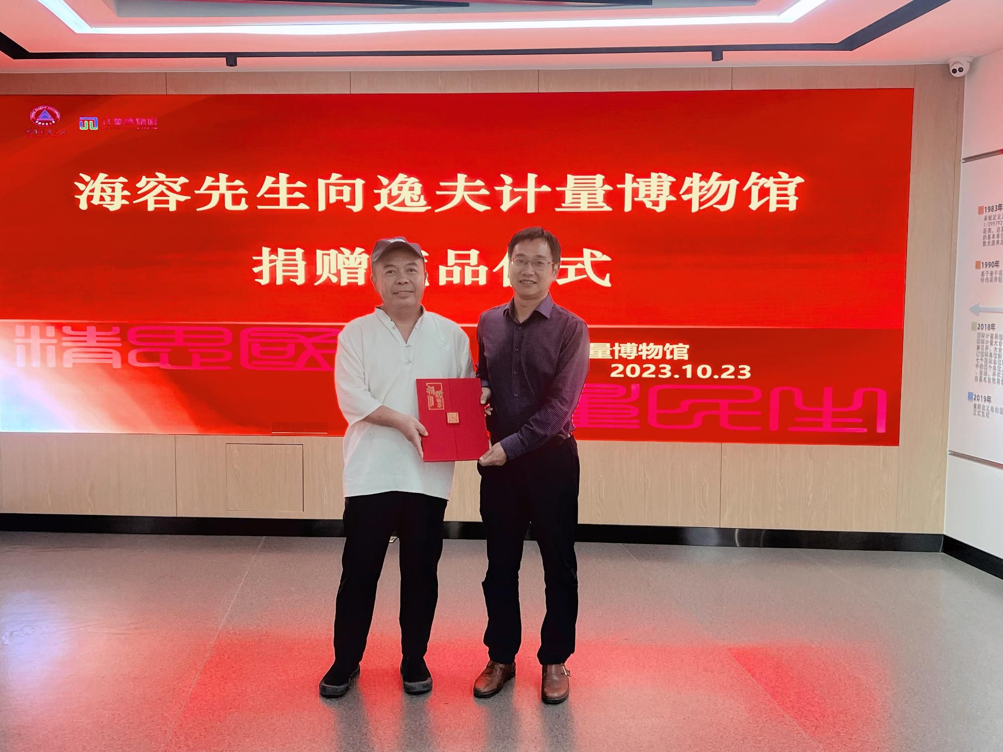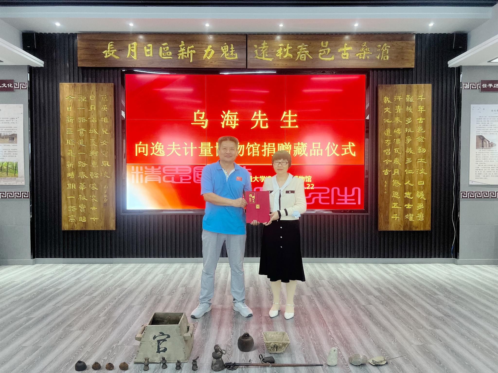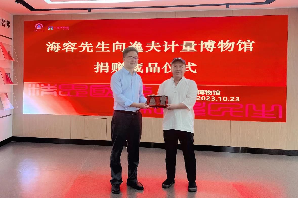 10月22号,博物馆工作人员赴山东省聊城市茌平区与乌海先生开展学术交流与研讨,乌海先生潜心收藏度量衡相关藏品二十余年,考虑到我校逸夫计量博物馆在国内计量行业领域的影响力,特意将珍藏的槐荫堂王、汉代铁权等17件(组)珍贵藏品无偿捐赠给博物馆,博物馆综合管理主任于俊嶙代表我馆接收了藏品。10月23日下午,国内知名度量衡收藏家海容先生与顾宇明先生来到逸夫计量博物馆参观交流,期间海容先生向逸夫计量博物馆捐赠了个人珍藏的2枚清代乾隆年间铁权。捐赠仪式由图书馆(档案馆、博物馆)馆长谢代梁主持,图书馆(档案馆、博物馆)副馆长虞华君代表我馆接受此次藏品的捐赠。
